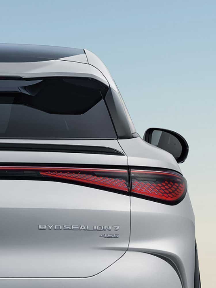 BYD Sealion 7 menampilkan lampu belakang ramping dengan garis cahaya modern, terinspirasi bentuk tetesan air, menciptakan efek visual dinamis seolah cahaya mengalir lembut.